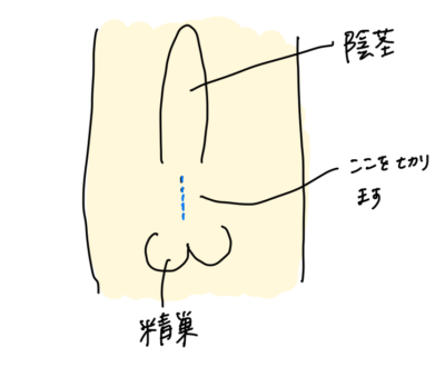 陰茎と陰嚢の間をメスで切って、精巣から伸びる血管を糸で結紮(止血)します。