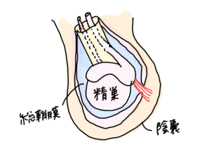 精巣の周囲には精巣上体が付着しており、総鞘膜→陰嚢の順に膜で覆われています。