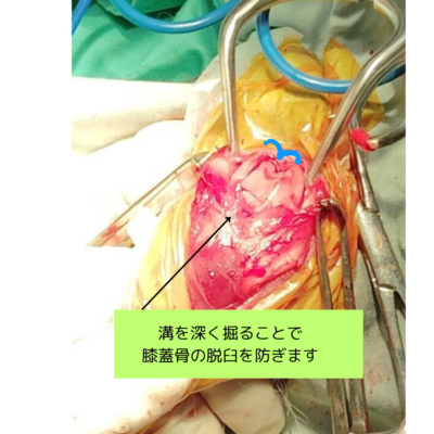 滑車溝形成術:大腿骨の溝を深くすることで膝蓋骨をここにはめこみ、外れにくくします。